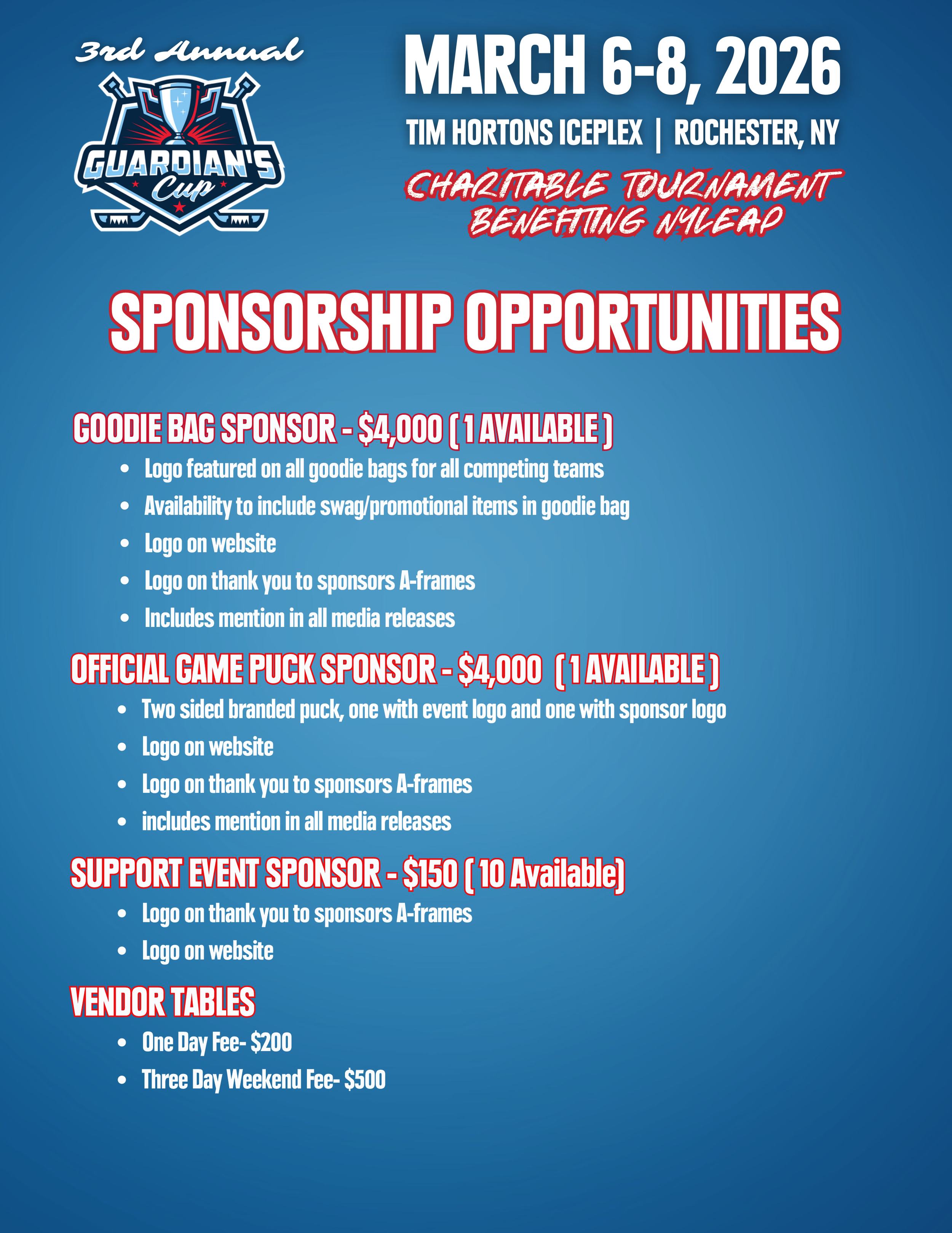 Tim Horton's Iceplex is proud to host the 3rd Annual Guardian's Cup, a hockey tournament for first responders. This exciting event occurs March 8th-8th and promises a weekend filled with friendly competition, camaraderie, and giving back to a worthy cause. The Guardian's Cup goes beyond the ice. It's a mission-driven tournament to raise awareness and critical funds for the New York Law Enforcement Assistance Program (NYLEAP). NYLEAP is dedicated to improving the mental health and overall well-being of all law enforcement and first responders in New York State.